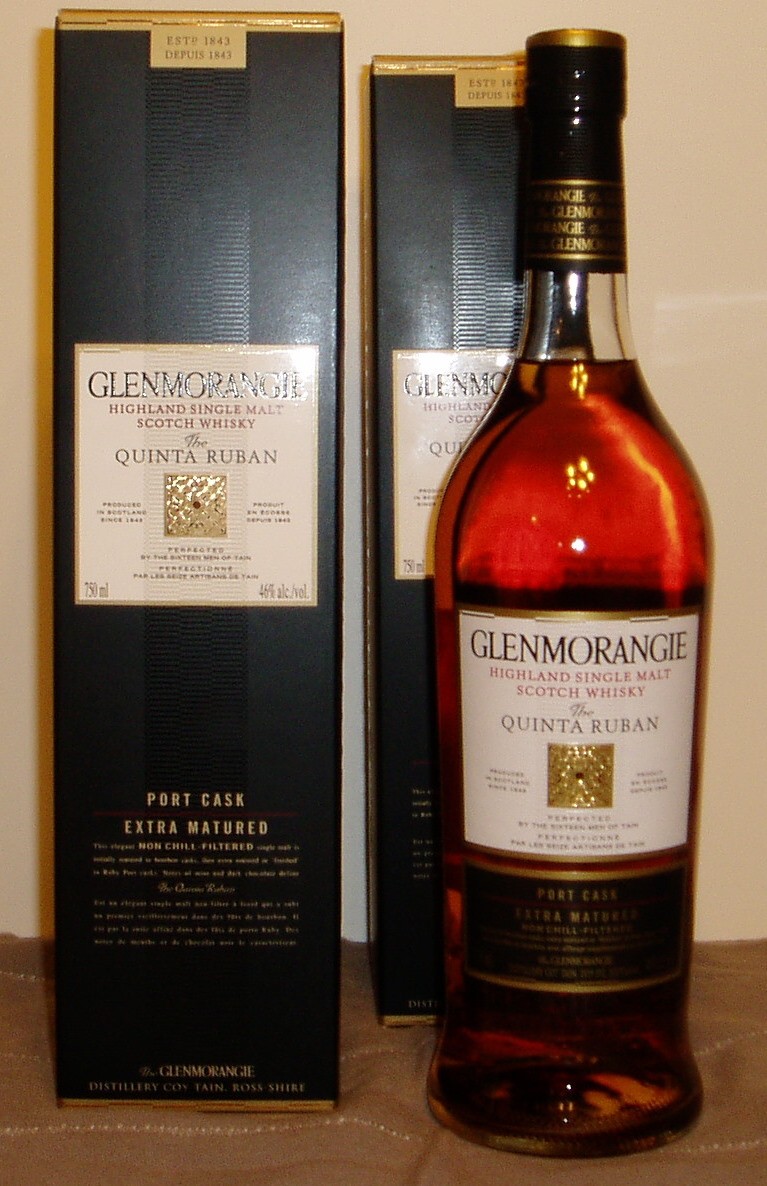 The Glenmorangie Distillery Company was officially licensed to produce whisky in 1843, and began with a tradition of uniqueness and innovation right from the start, beginning with the construction of tall gin styled stills instead of the traditional onion shaped stills in use at the time. Glenmorangie also was amongst the first distilleries to used American Oak for aging the whisky, as well as at the forefront of the new wave of unique wood finished whiskies. In fact the core range of Glenmorangie includes three unique wood finishes; the La Santa which is a Sherry finish, the Nector D’or which is a Sauternes Wine finish, and the whisky which I am reviewing in this article, The Quinta Ruban, which is a Ruby Port Finish. Here is a link to the Glenmorangie website for more information on their history and their core range of whiskies.