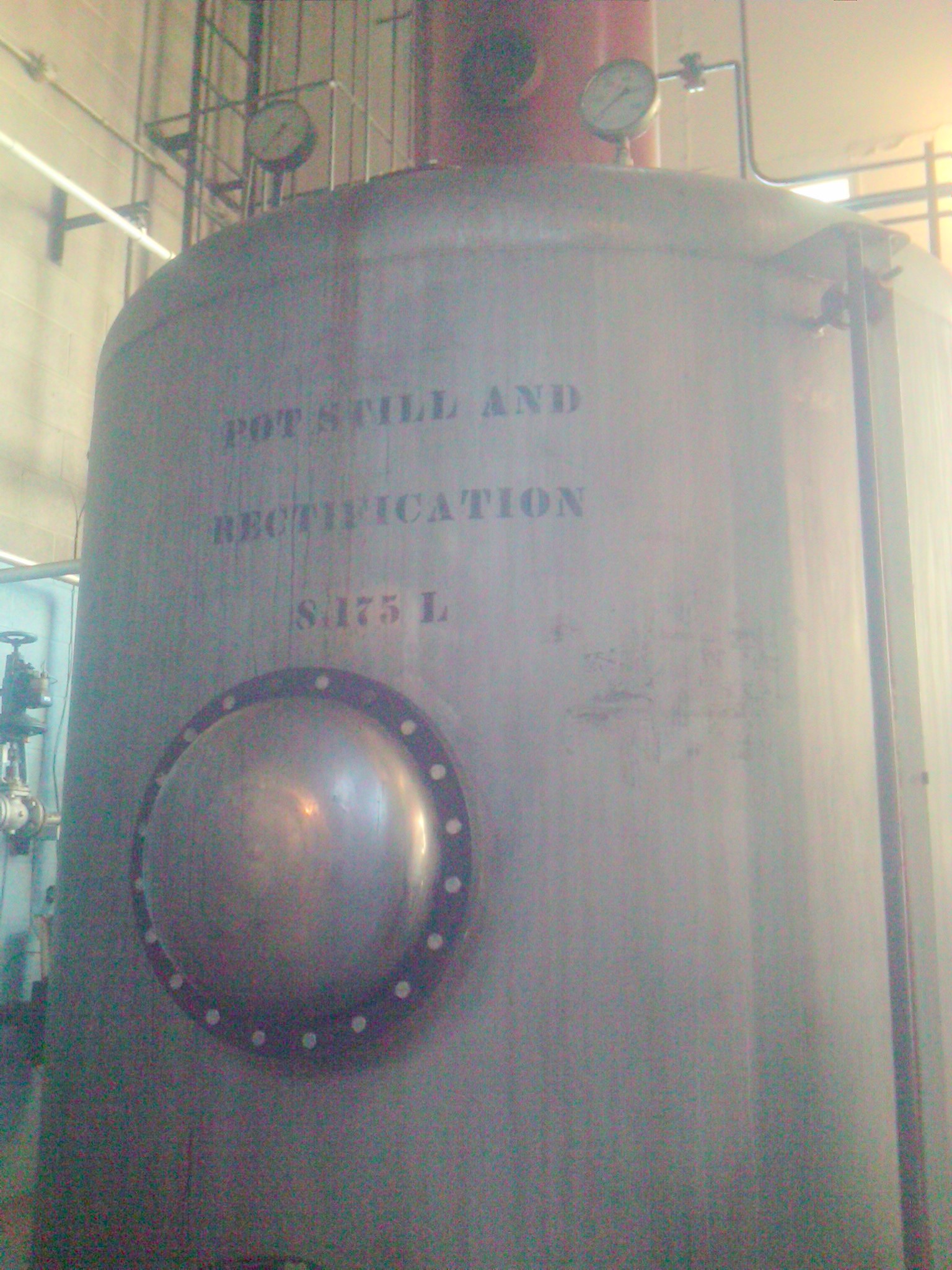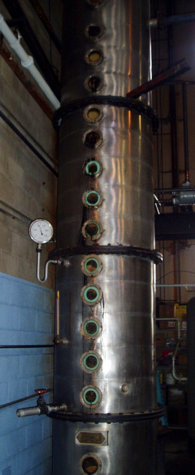 The picture to the right is the pot still. The pot still has a pot shaped bottom with a 50 foot stack attached to the top. The high wine is heated to 80 degrees Celsius by steam which travels through copper pipes inside the still. This causes alcohol to evaporate and rise up the column stack. (Alcohol evaporates at a lower temperature than water and is the first liquid to evaporate up the stack.) It condenses back into alcohol at 95-96%.