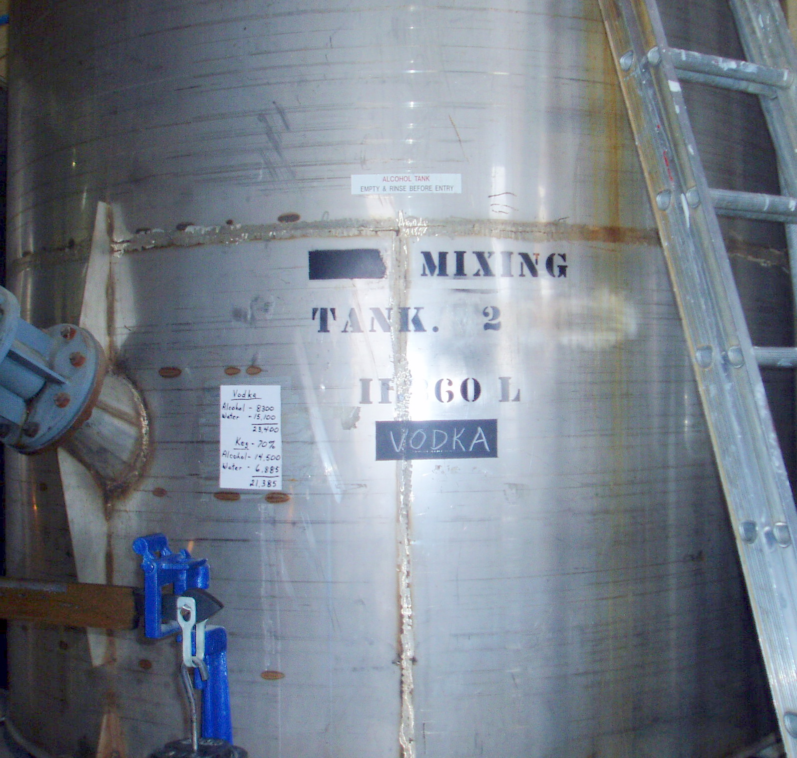 The next step in the procedure is blending. Some products go directly into the blending tanks from distillation (Liqueurs, Vodka and Flavoured Vodka). Others are blended after aging. There is 29 blending tanks in total, 3 scaled with a total volume of 500,00 litres. The blending tanks have agitators which will ensure that essences and flavouring agents added at this stage blend thoroughly.