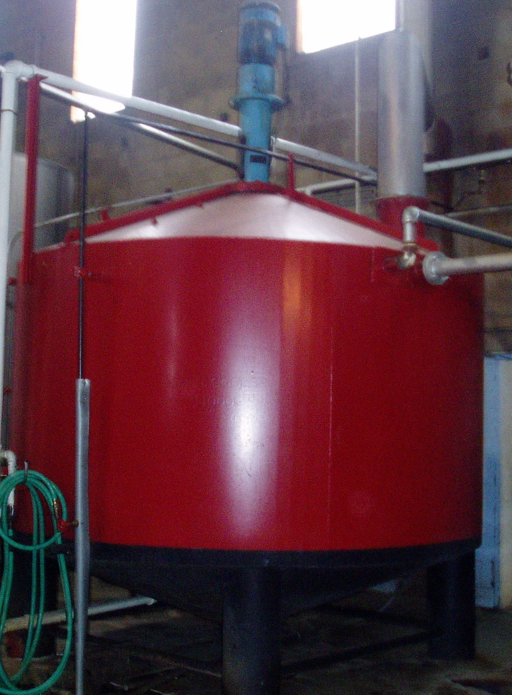 The nest picture I have is the red cooling vessel. The cooked mash from step 1 is pumped into the cooler where the mash temperature is brought down from 120 degrees Celsius to 20 degrees Celsius. It is at this stage that natural enzymes are added to break down the starches to glucose, and yeast is added to start the fermentation of the glucose to alcohol. From the cooler the fermenting mash is transferred to the fermentation tanks. These tanks were in a separate part of the distillery and I was not able to take any cool pictures of them. I was not surprised at not seeing the fermentation tanks as this would be a very controlled environment. Contamination of the yeasts is always a concern as each distiller has their own specific yeast cultures which provide a desired taste and fermentation yield.
