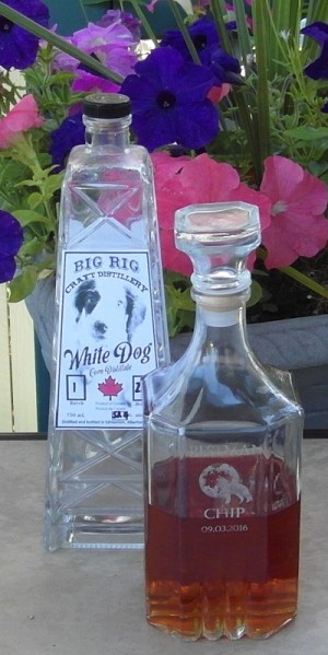 The old Rig Hand bottle in almost identical to the new Rig Hand bottle and it captures the heart of Oil Country (in Alberta, Canada) quite well. The Bottle is shaped like an oil derrick complete with ribbing on the bottle designed to look like the trusses from which such rigs are constructed. The label is simple, I like the Canadian Flag (it’s good to be proud of you home country) and I like how each bottle is hand numbered. My bottle of White Dog Malted Barely Distillate is from the very first batch, and is bottle number 80.