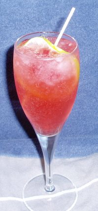 Garnish with a thin lime slice folded around a Brandied Cherry with a spear through it.