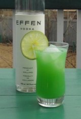 The Effen Vodka arrives in one of those tall sleek bottles that have started to populate the spirits landscape (see picture to the right). A rather unique feature of the bottle is the beige rubber-like sleeve which gives the bottle a clean look, and makes it very easy to grip. The label is very simple, but it has remarkable ‘pop’ on my bar shelf. I am however, disappointed in the plastic screw-cap which looks like the cap of a cheap medicine bottle rather than a topper for a quality vodka.