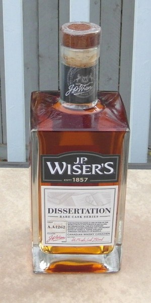 I like the J.P. Wiser’s Dissertation bottle with its squat square shape. It has substance, and although it is not as tall as some of my other whisky bottles upon my shelf; it nevertheless seems to command attention with its square masculine form. In fact, it looks like a decanter more than a bottle, and when I pour out a dram for myself, there is a sense of satisfaction in holding the heavy masculine bottle.