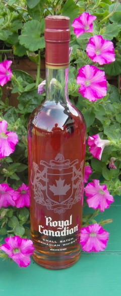 I snapped a photo of the sample bottle of Royal Canadian Small Batch out on my back deck. As you can tell the whisky arrives in a rather tall bottle which although nice, lacks the frills I normally associate with a premium whisky. The etched coat of arms on the bottle is a nice touch, although as you can see from the picture, it really does not stand out in any substantial way. (Although etched glass is nice, the lack of colour contrast makes etchings hard to see unless the light is just right.) I would like to see a little colour added to the label which would give the presentation ‘pop’ on my bar shelf. As it is, the whisky bottle just sort of blends in and disappears next to my other whiskies.