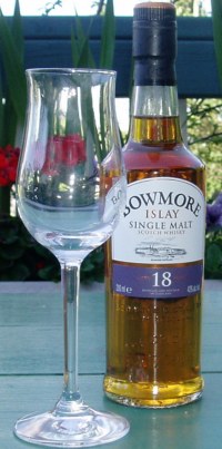 The presentation for the Bowmore 18 Year Old is shown to the right. The presentation (except for the labels) is exactly the same as for the previously reviewed Bowmore 12 and 15. The bottle is in the style of a bar room whisky, designed to be easy to hold, easy to pour, and of course easy to store on the bar shelf. This presentation is simple but classy. I am pleased that the closure is a high density cork which seals the whisky in properly and gives me that nice satisfying ‘pop’ when I first open the bottle.
